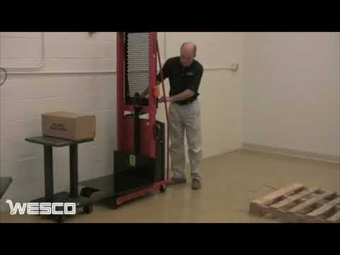 The Adjustable Span Straddle Powered Stacker, available is designed for efficient material handling with a 1000 lb capacity. Featuring a Wesco-manufactured hydraulic cylinder known for proven quality, this stacker includes a battery and charger. The forks lower to the floor on all models for easy loading and unloading of pallets. The extra deep (40") straddle legs and forks are perfect for lifting pallets, and the versatile adjustable span straddle legs can be set from 34" to 50" inside dimensions to handle most standard pallets.