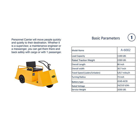 The APOLLOLIFT A-6002 is a compact seated electric tow tractor designed for efficient and quiet personnel transport within large industrial facilities such as warehouses, factories, and airports. With a 1100 lb load capacity and speeds up to 8.7 mph, this personnel carrier is built for comfort, control, and long-lasting daily use.