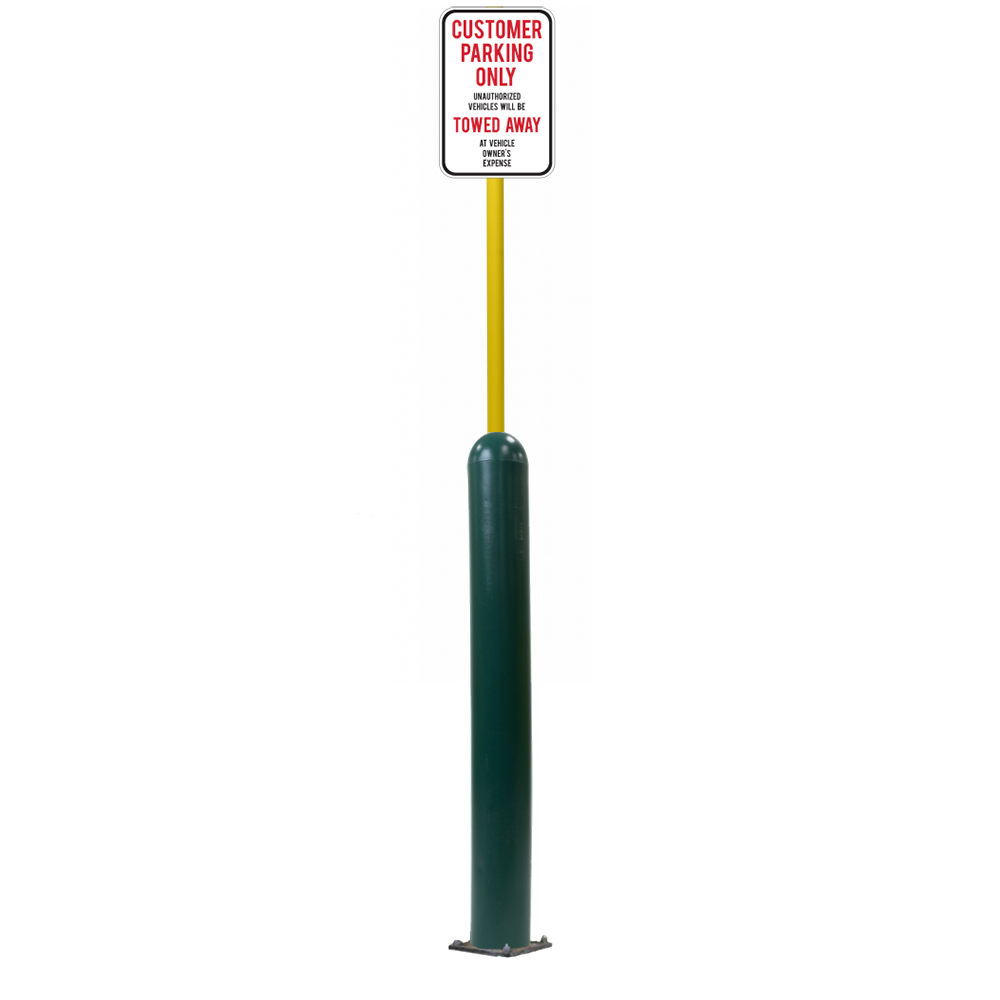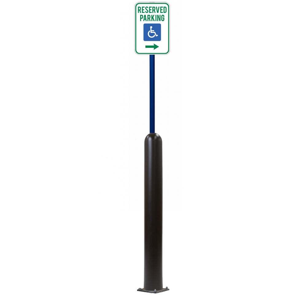 Our Bollard Sign Systems are steel pipe bollard sign post systems that are sleeved in a Bollard Cover and fabricated to include a steel signpost. The full sign system is a great alternative to regular steel parking lot signs which require constant paint jobs and repairs.