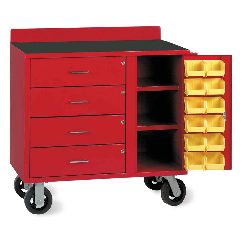 Organize your maintenance shops, open floor workstations, and other rooms with the strategically designed 4-drawer and 1-door configuration. Each drawer rolls smoothly on premium drawer glides and ball bearings, have a 5" height, and a 100 lb. capacity per drawer. The one door has two interior shelves and bin brackets on the interior of the door to hang the included storage bins. Storage bins measure 4 1/8"W x 5 1/2"D x 3"H. Each drawer/door has an individual lock, allowing you to secure certain items while leaving others unlocked and available. All drawers/door are keyed-alike so you are not juggling multiple keys. A 3" raised back lip and an included vinyl non-slip mat for the top helps keep tools and material from rolling off. The right side of each workbench has a welded handle for convenient and ergonomic push/pull operation (handle extends 5"). Easily maneuver workbench on (4) 5" non-marking rubber casters: 2 rigid, 2 swivel.